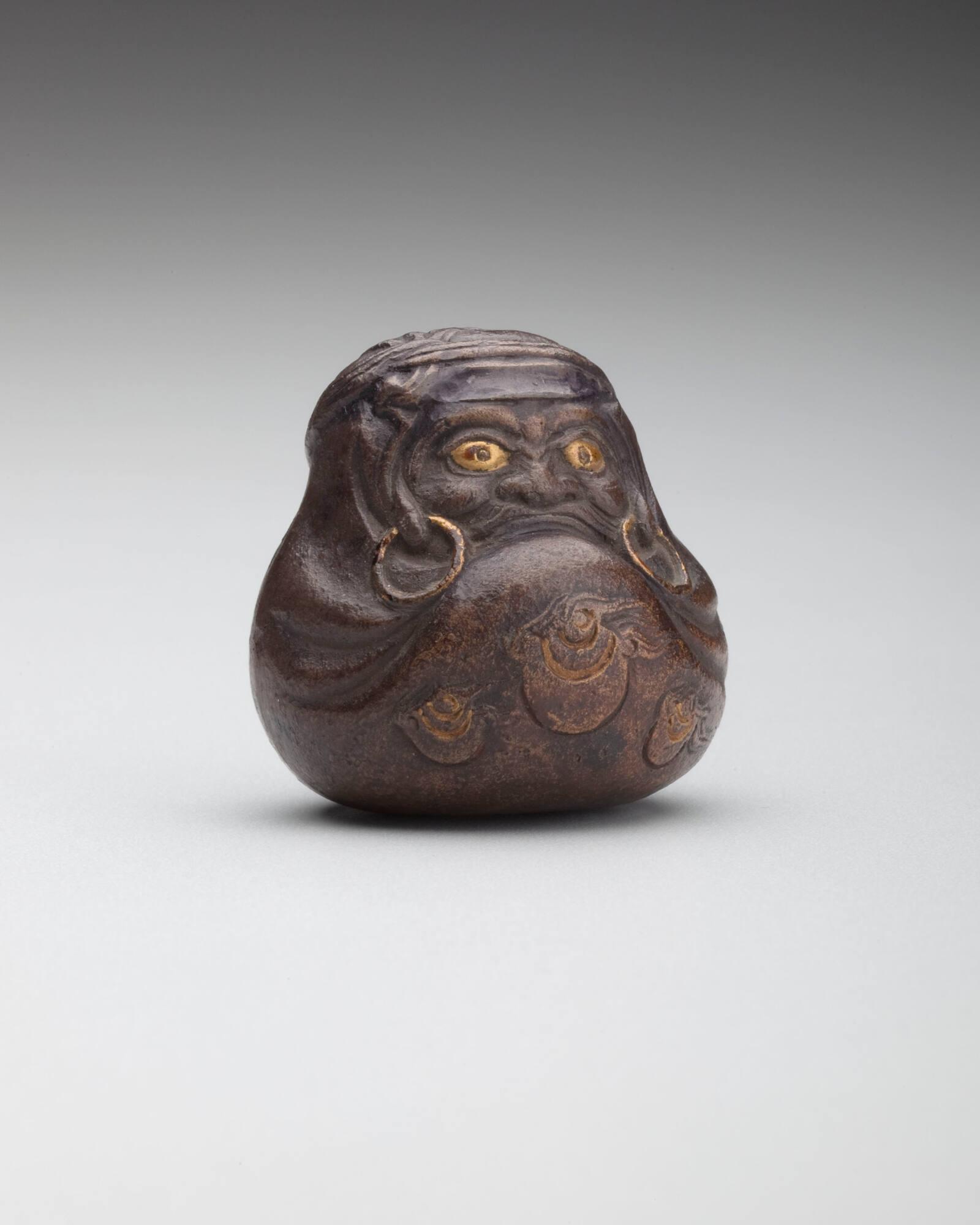 DescriptionTraditional Daruma of Bizen, gold eyes. Bizen ware; glazed earthenware with gold enamel.