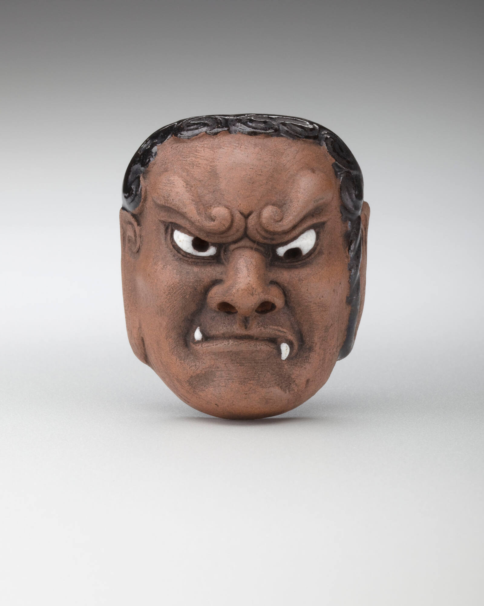 DescriptionBlack hair, white teeth and fangs. Onko ware; earthenware with white glaze and stain.