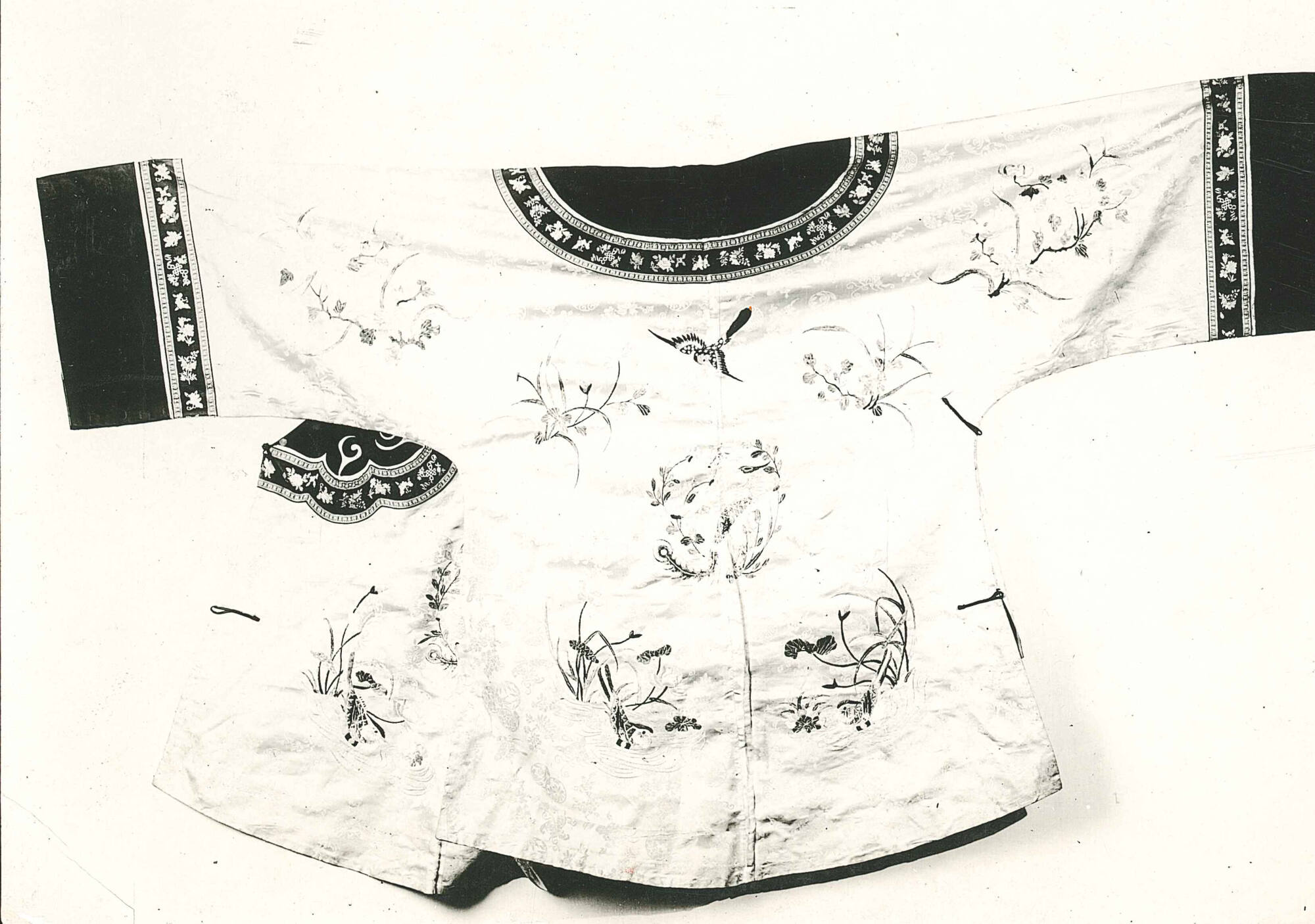 DescriptionBirds and flowers embroidered in color on a sage green ground with a black collar.