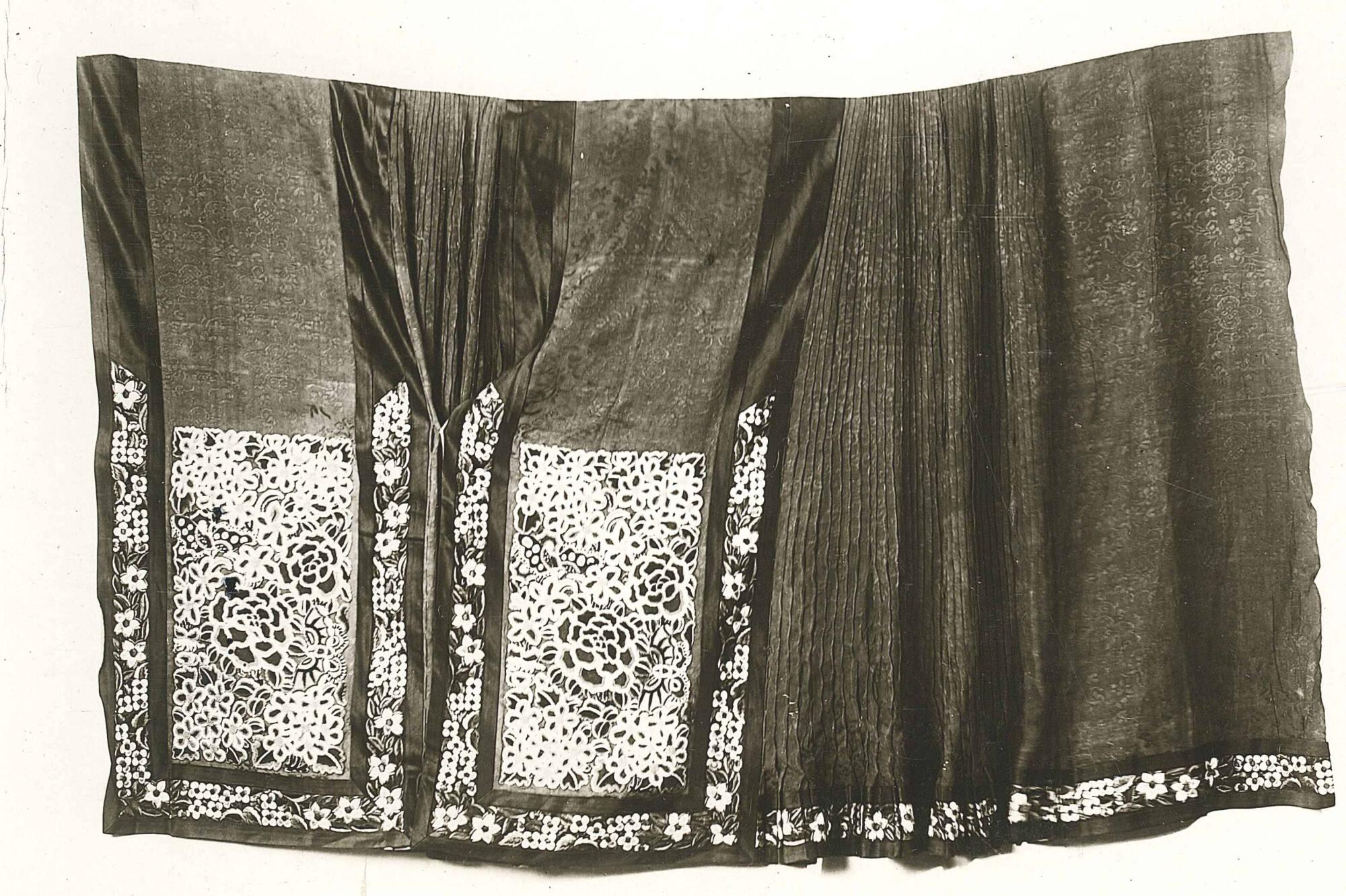DescriptionRed Han damask skirt embroidered with blue, white, green, and metallic stitches. Center panel motifs are appliqué. Embroidery panel and hemline is trimmed with 6/1 (possibly 7/1) black satin applied on the bias with a satin stitch embroidered black silk insert.