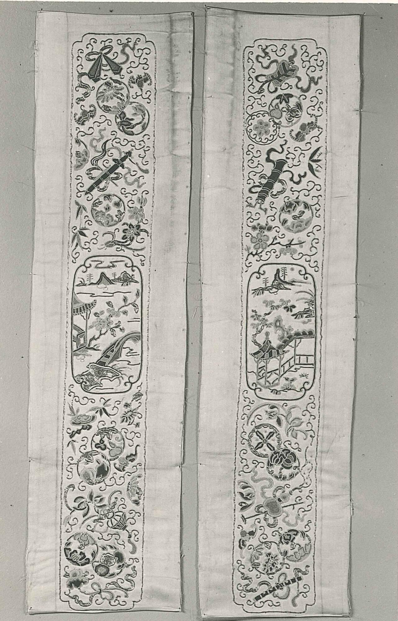 DescriptionEight Taoist emblems, a central panel, and floral motifs in seed stitch; pastel colors; couched gold threads; white satin ground.