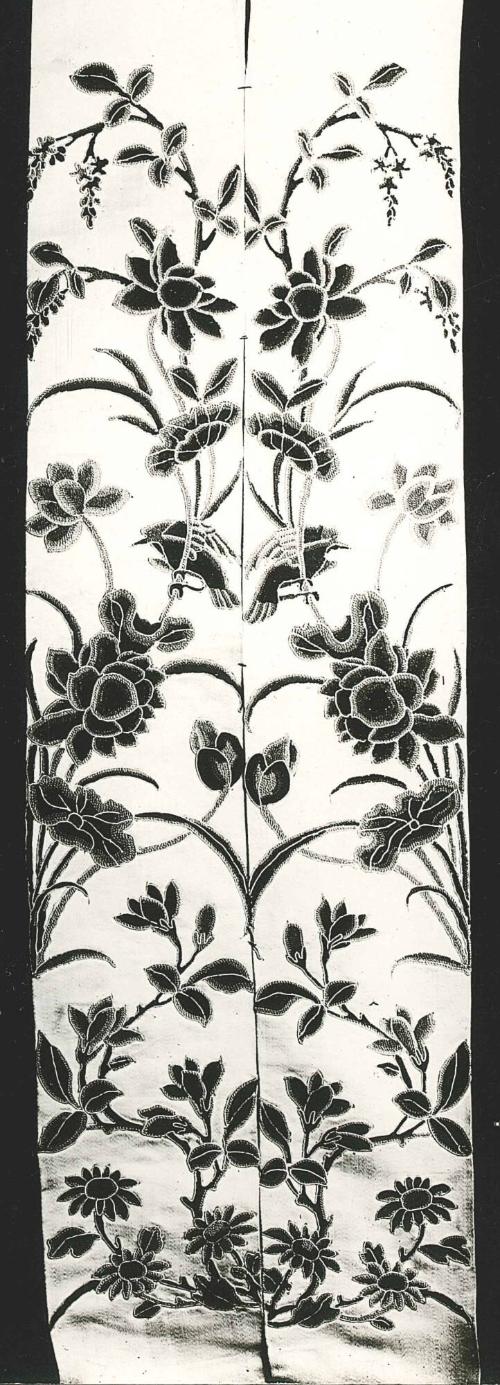 DescriptionLotus and flower sprays embroidered in colors on a white ground.