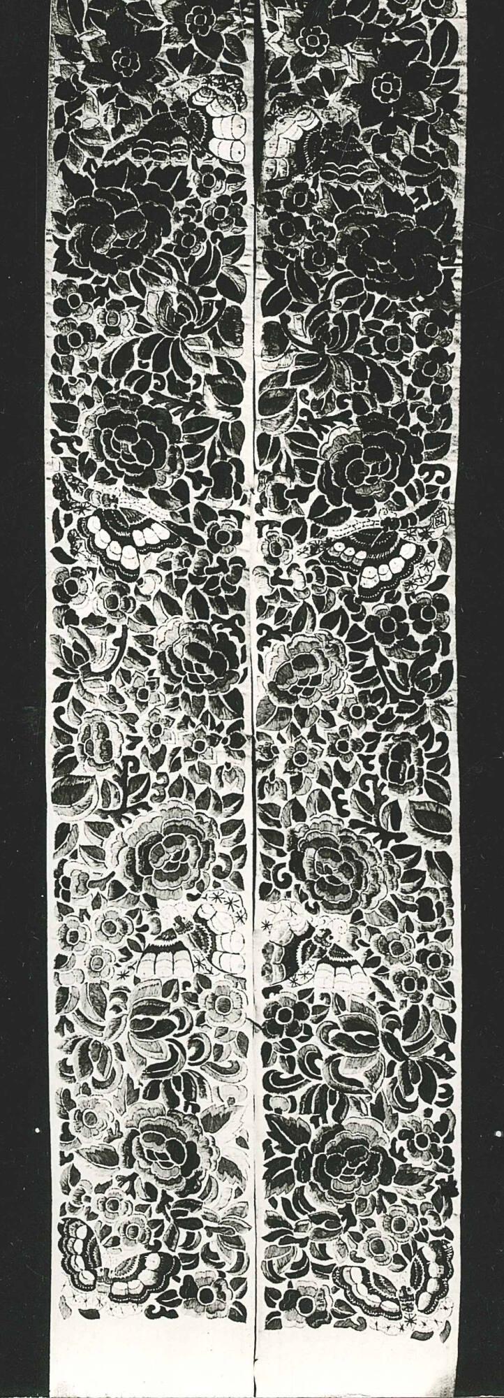 DescriptionFlowers embroidered in blues on a salmon colored ground.
