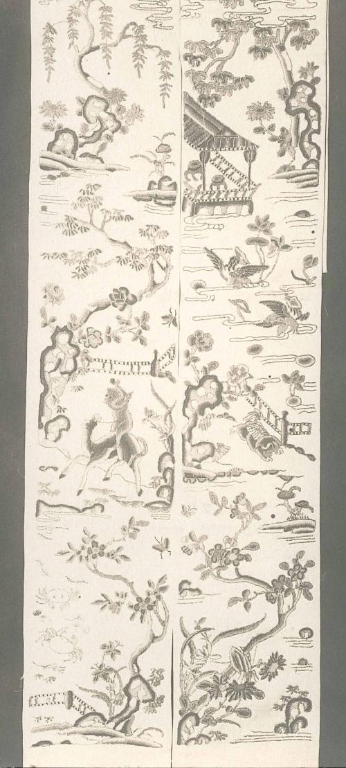DescriptionDemon on four footed animal and flowering trees embroidered in colors on a white satin ground.
