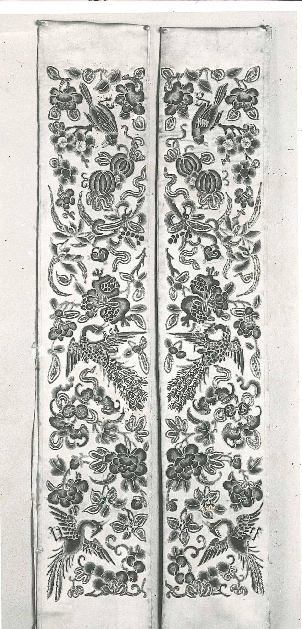 DescriptionBirds and flowers in blues and gold thread on a greenish ground.