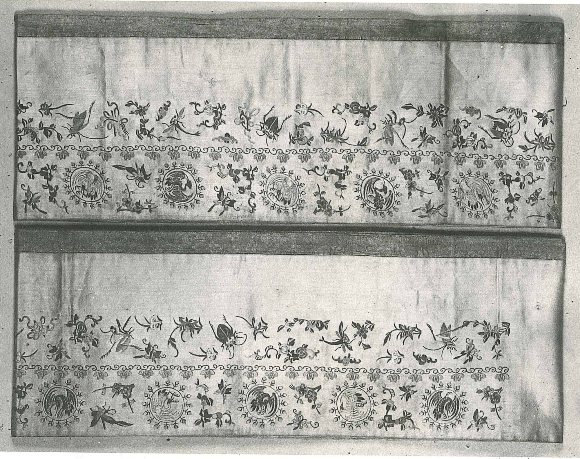 DescriptionInsects, flowers, and birds in circles; bright colors on a mustard colored ground.