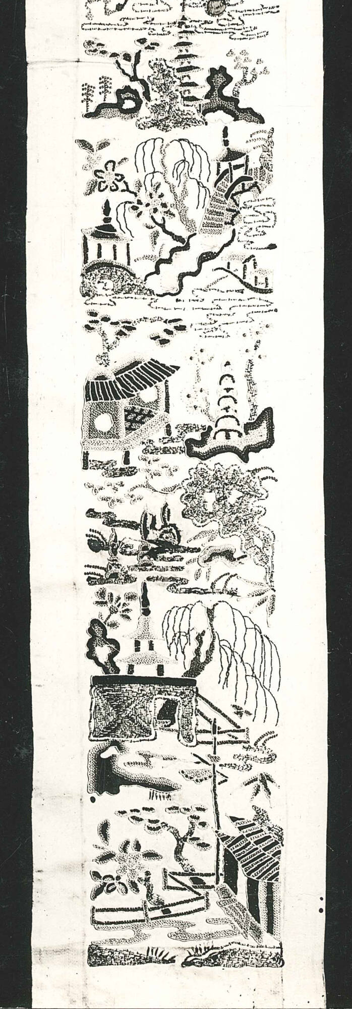 DescriptionGarden scene; Pavilions, pagodas, and flowers embroidered in color on a white satin ground.