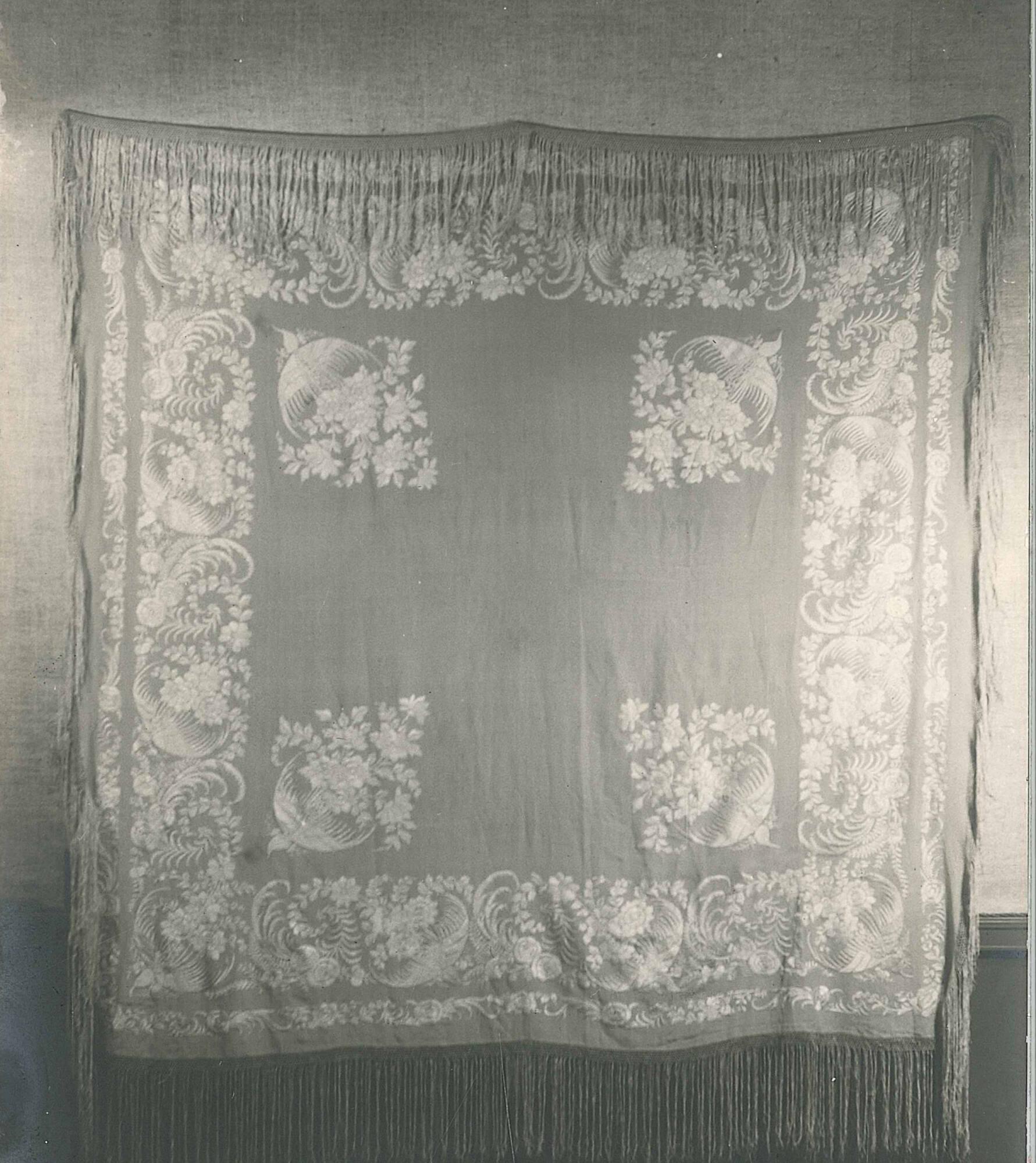 DescriptionFloral design in yellow on a coral ground. 8 in. Yellow fringe.