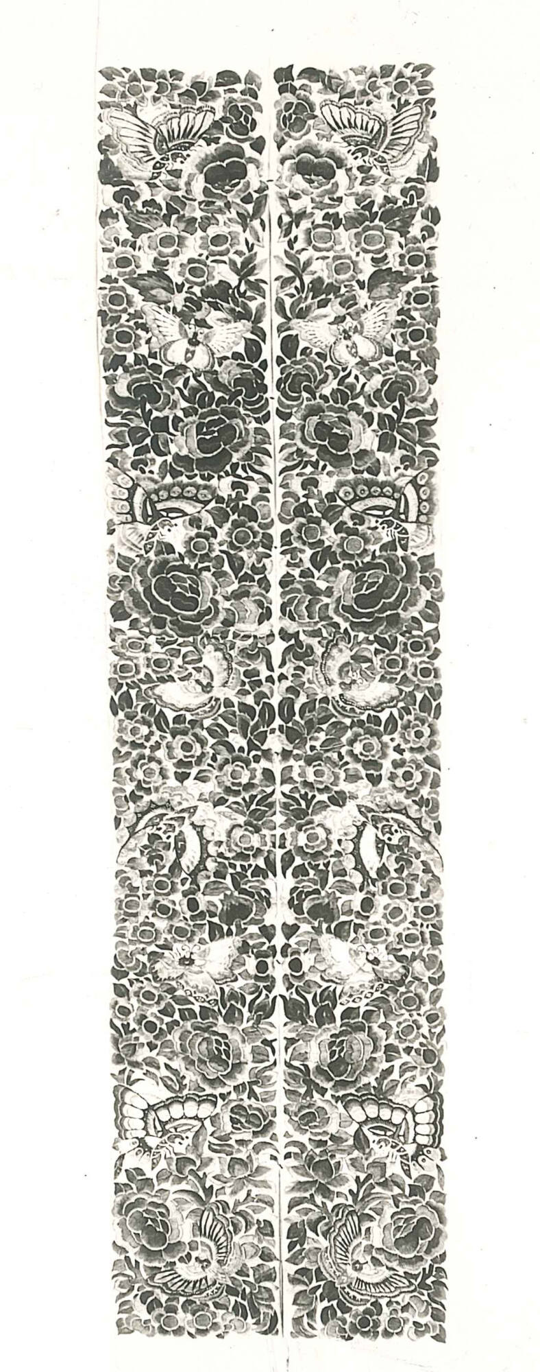 MediumSilk embroidery; Blue flowers and multi-colored butterflies, on a yellow ground.