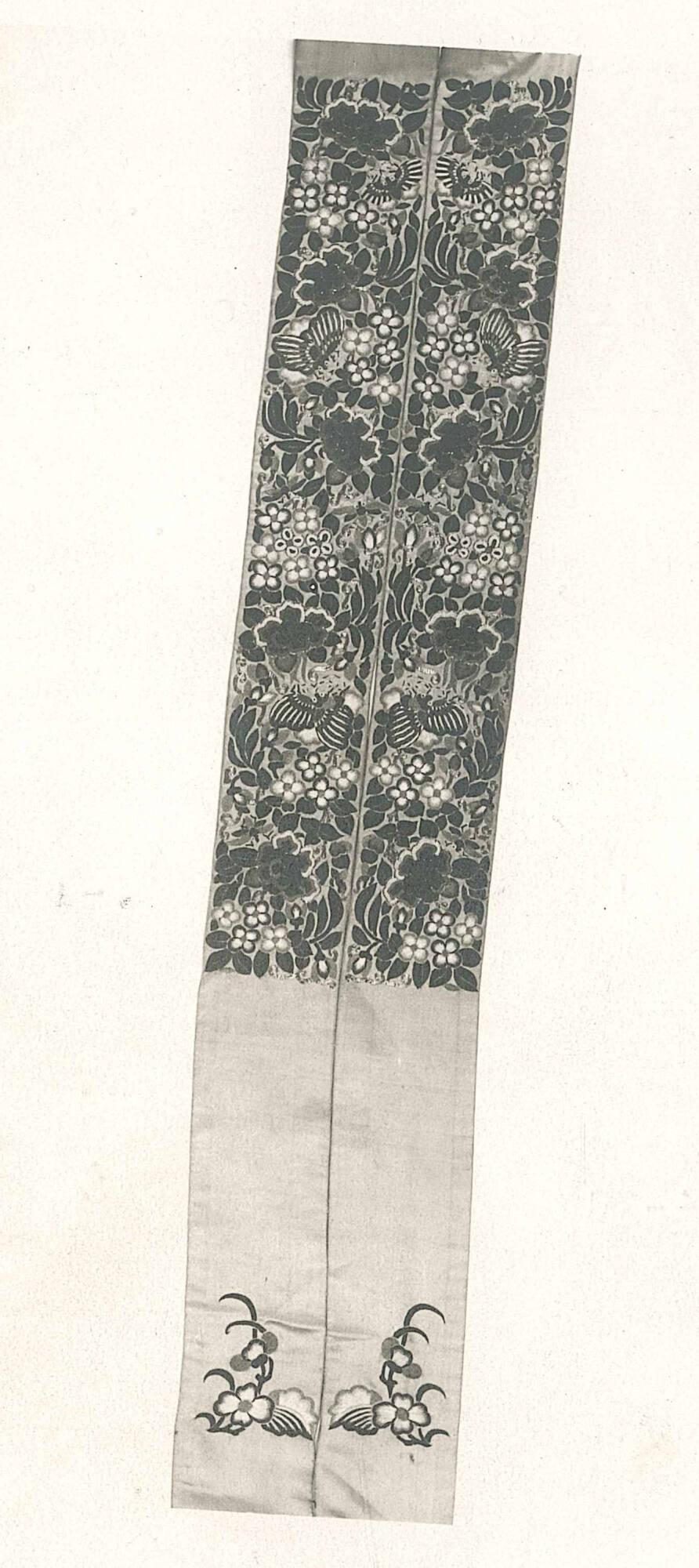 MediumSilk embroidery; miscellaneous flowers and butterflies in blue, green, white, and gold on a green ground.