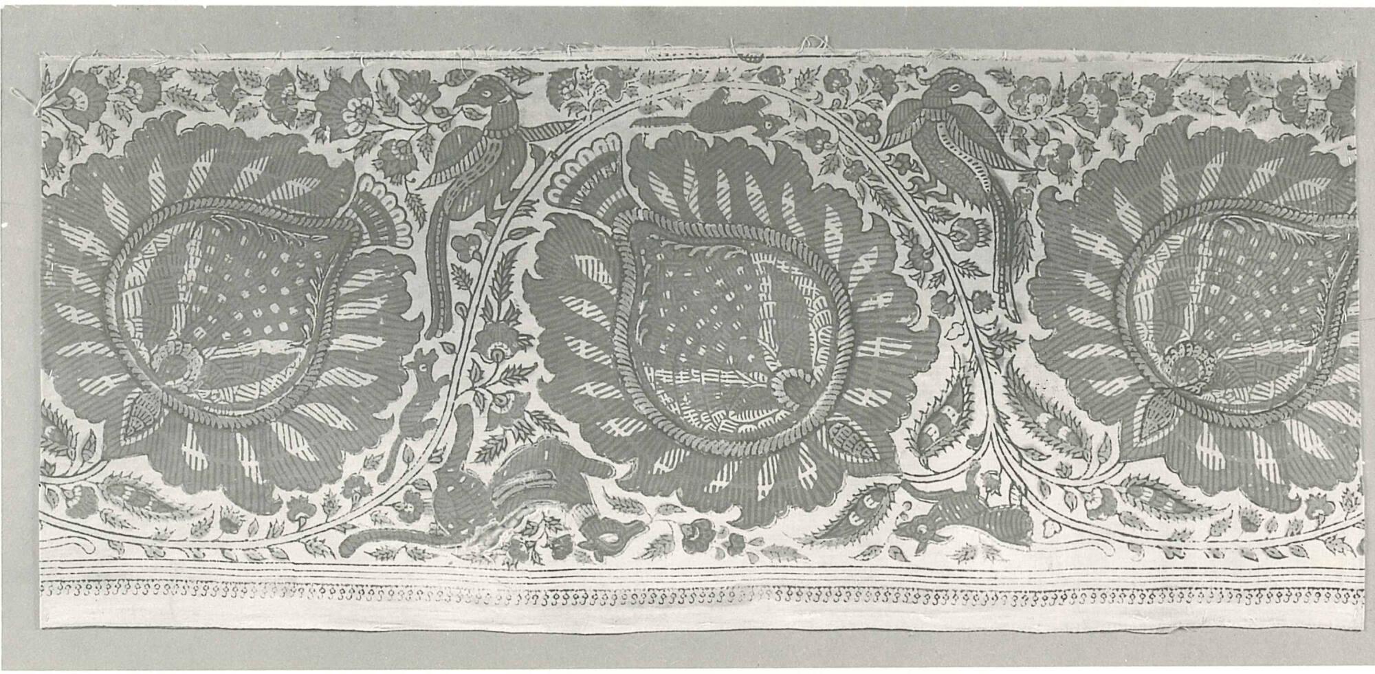 DescriptionFloral scroll, with birds and animals; red and blue on a white ground; block printed.
