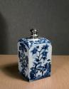 DescriptionBlue and white ware porcelain bottle with silver mount for stopper. Metal (silver) mounts are European.