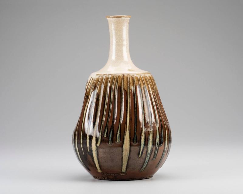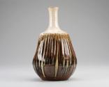 DescriptionNeck, gray crackle; body, fluted, brown and gray, with four depressions. Rough base.