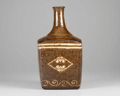 DescriptionBrown pitted glaze, each side decorated with a conventionalized flower lozenge form. 2 parallel lines above and scroll motif below in white.