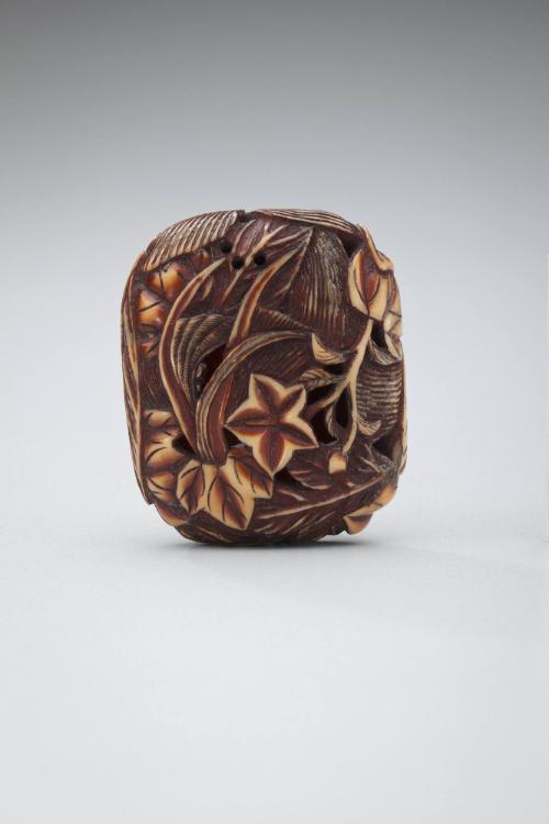 DescriptionIvory; hollow, stained brown; carved with lotus, omodaka and other leaves, and a flowering Kikyo plant.