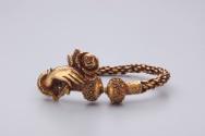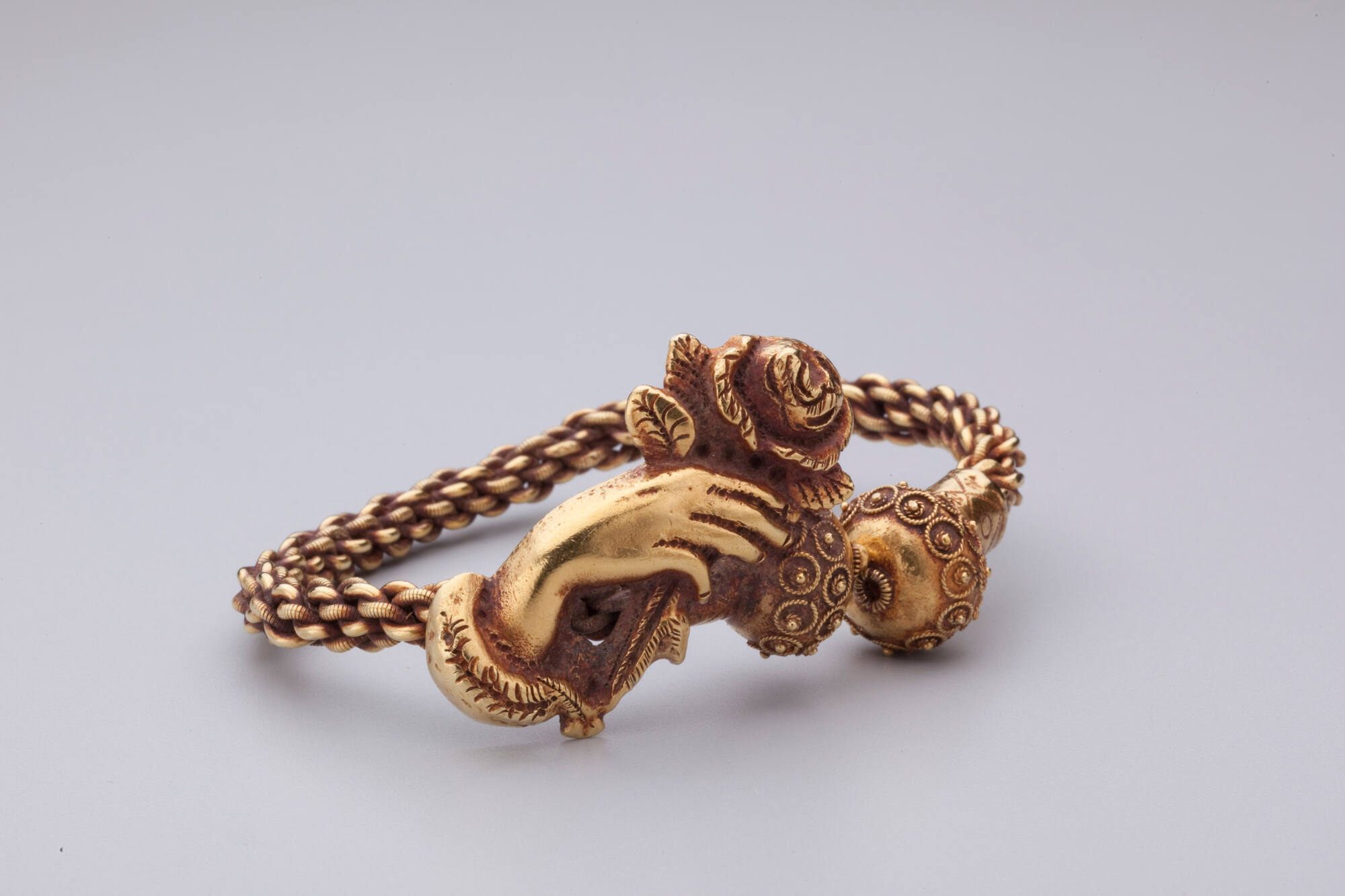 Label TextThis set of bracelets once belonged to an Ashanti queen mother (mother of the ruler), a key advisor to the king. The oldest bracelet features strikingly asymmetrical twisted forms and incised decoration and a cowrie-shaped finial that symbolizes wealth, fertility, and status. The bracelet of braided wire has a cast ornament of a woman’s hand holding a rose, a design influenced by imported European jewelry and pattern-books. Hands symbolize authority among the Ashanti. The third bracelet represents royal power, with three cannons, two executioner’s swords, and stacks of protective soul discs (akrafokonmu). The queen mother wore the bracelet with cannons and swords on her right forearm, cannons facing forward, and the other two on her left forearm.Published ReferencesCf. Doran H. Ross, with contributions by Frances Marzio, Gold of the Akan from the Glassell Collection, exhibition catalogue, Houston, TX, The Museum of Fine Arts, Houston, 2002. Note: Alfred C. Glassell Jr. donated his collection of more than 900 objects of gold jewelry and ceremonial gilded objects made by the Akan peoples of Côte d'Ivoire and Ghana, was donated to the MFAH in 1997; a selection of 140 objects formed a world tour. Fig. 7.14A-D illustrates ball-tip bracelets, and Fig. 7.15 reproduces a plate of "Rolled Gold late Bracelets" from S. F. Myers & Co., New York, catalogue (1894) with related forms. Fig. 7.26A-D illustrates pendants and rings with hands holding flowers. Fig. 6.41A-C illustrates chief's bracelets with cannon. Cf. Fritz Falk, et al., Ife, Akan and Benin: West African Art from 2000 Years: Gold, Bronzes, Terracottas, exhibition catalogue, Schmuckmuseum Pforzheim, Stuttgart, Arnold, 2000.Cf. M. D. McLeod, The Asante, London, British Museum Publications, 1981. Chapter 5, Gold and Gold-working, includes pp. 79-83 on the lost-wax technique used by an Asante goldsmith (egufo?).Mid 19th century