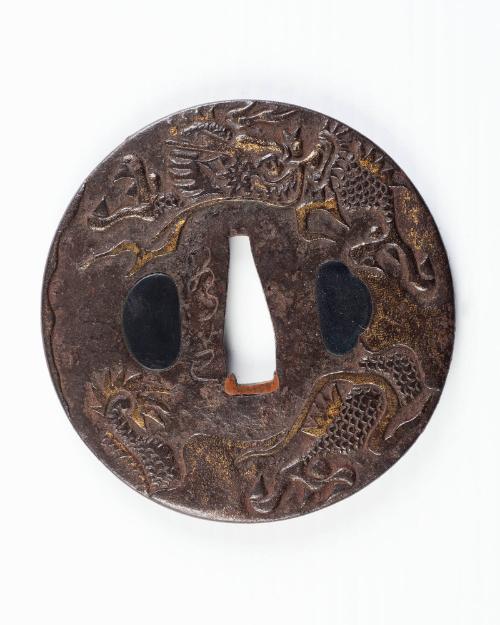 Sword Guard (Tsuba): (front) dragon amid flames and clouds; (back) clouds, flames, and a glimpse of the dragon's body
