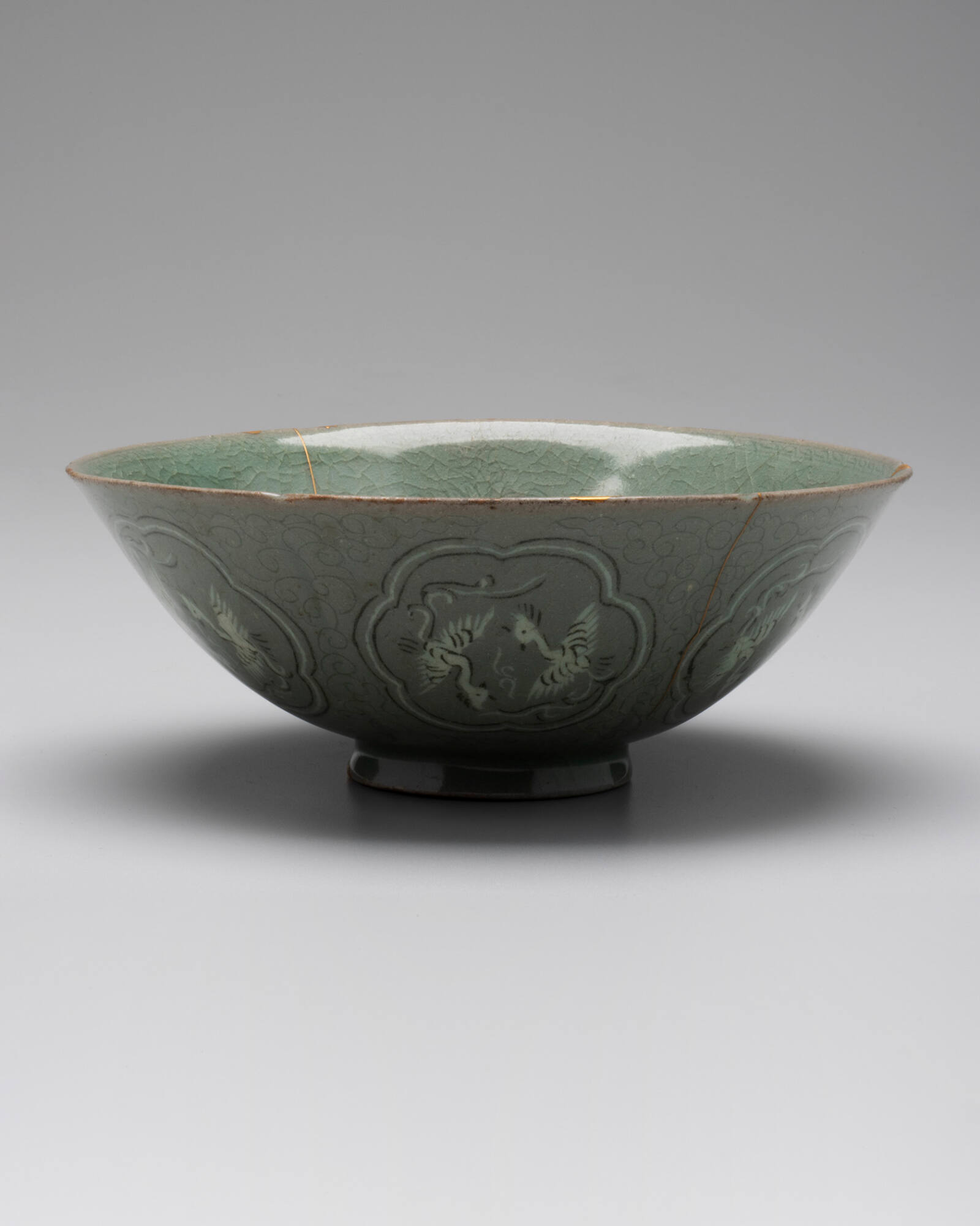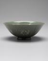 MediumGreen glaze. Incised pattern inside. Inlaid black and white medallion outside.