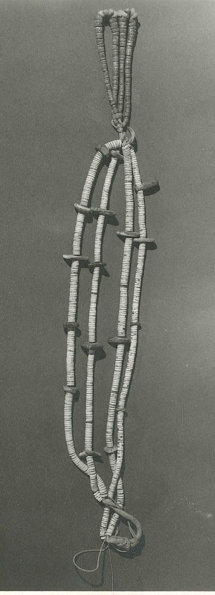 DescriptionDouble strand heishe beads with a double jacla (jacla are earrings that are often attached to the base of the necklace to create a pendant-like design).