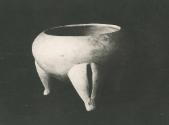DescriptionSan Miguel-Tarragó Biscuit ware. Small unglazed incurve tripod bowl with hollow conical supports containing loose clay pellets. Made from earthenware of reddish clay.