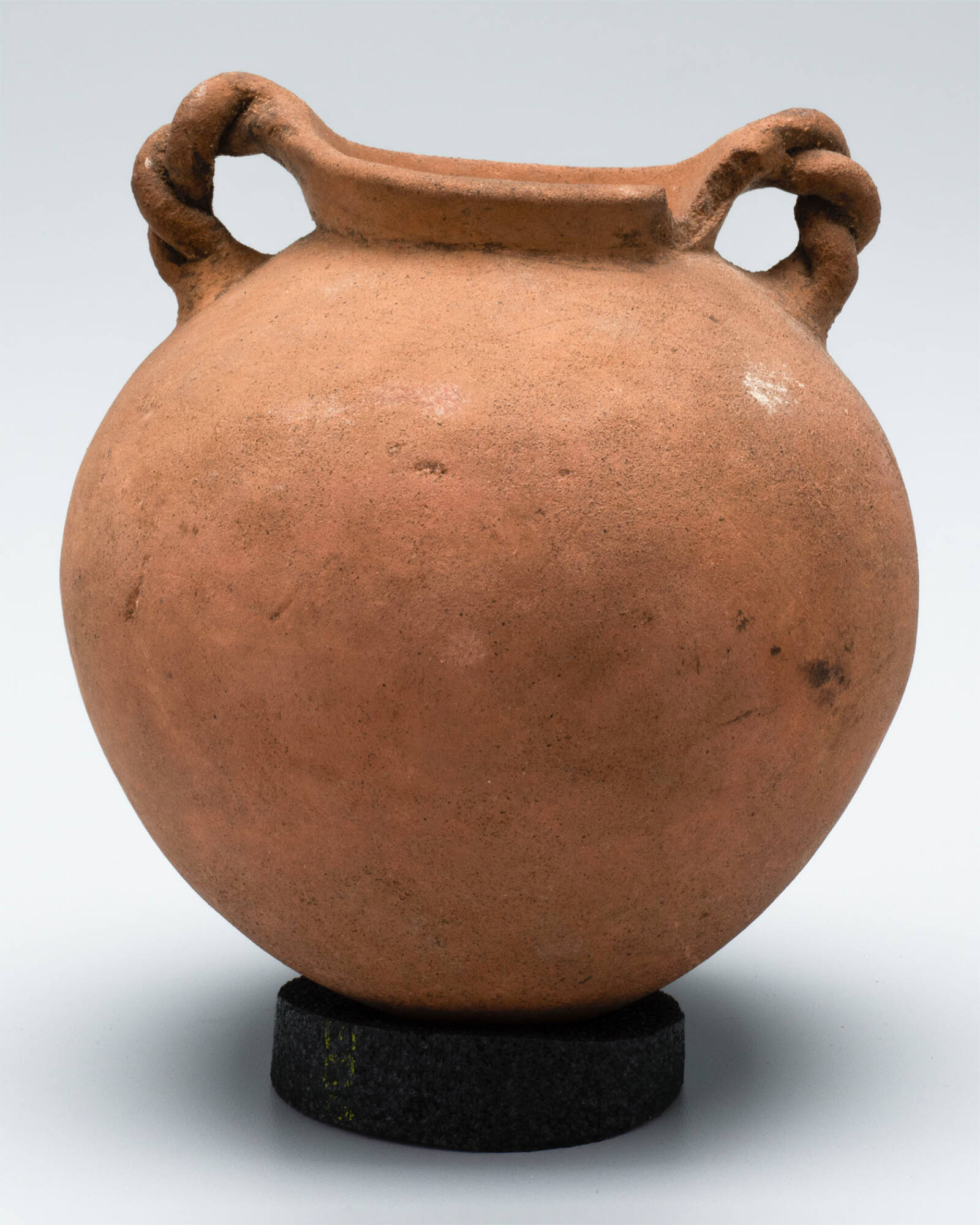 DescriptionUnglazed, rounded bottom; handles, twisted-rope motif.