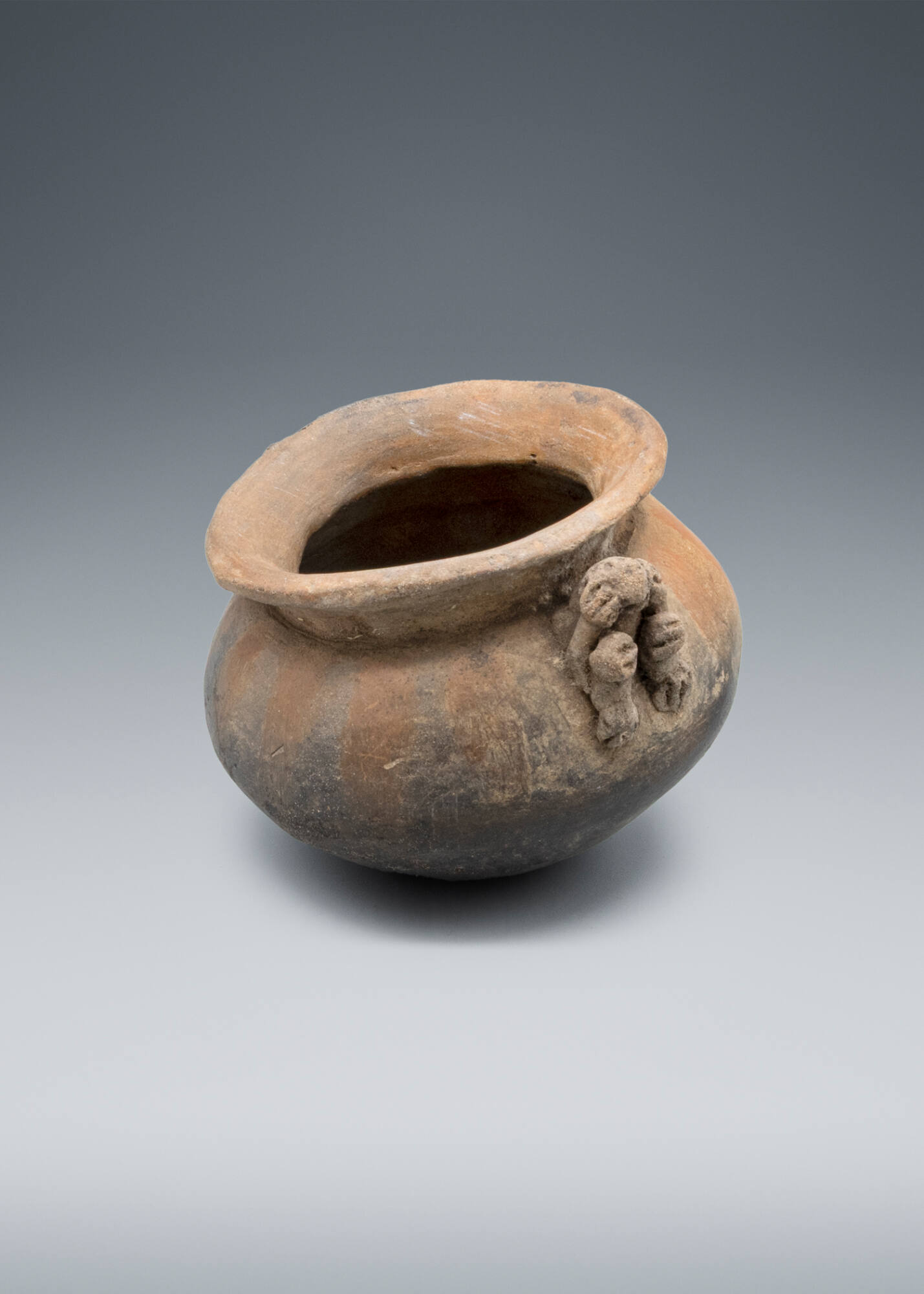 DescriptionPolished red surface, blackened by fire.