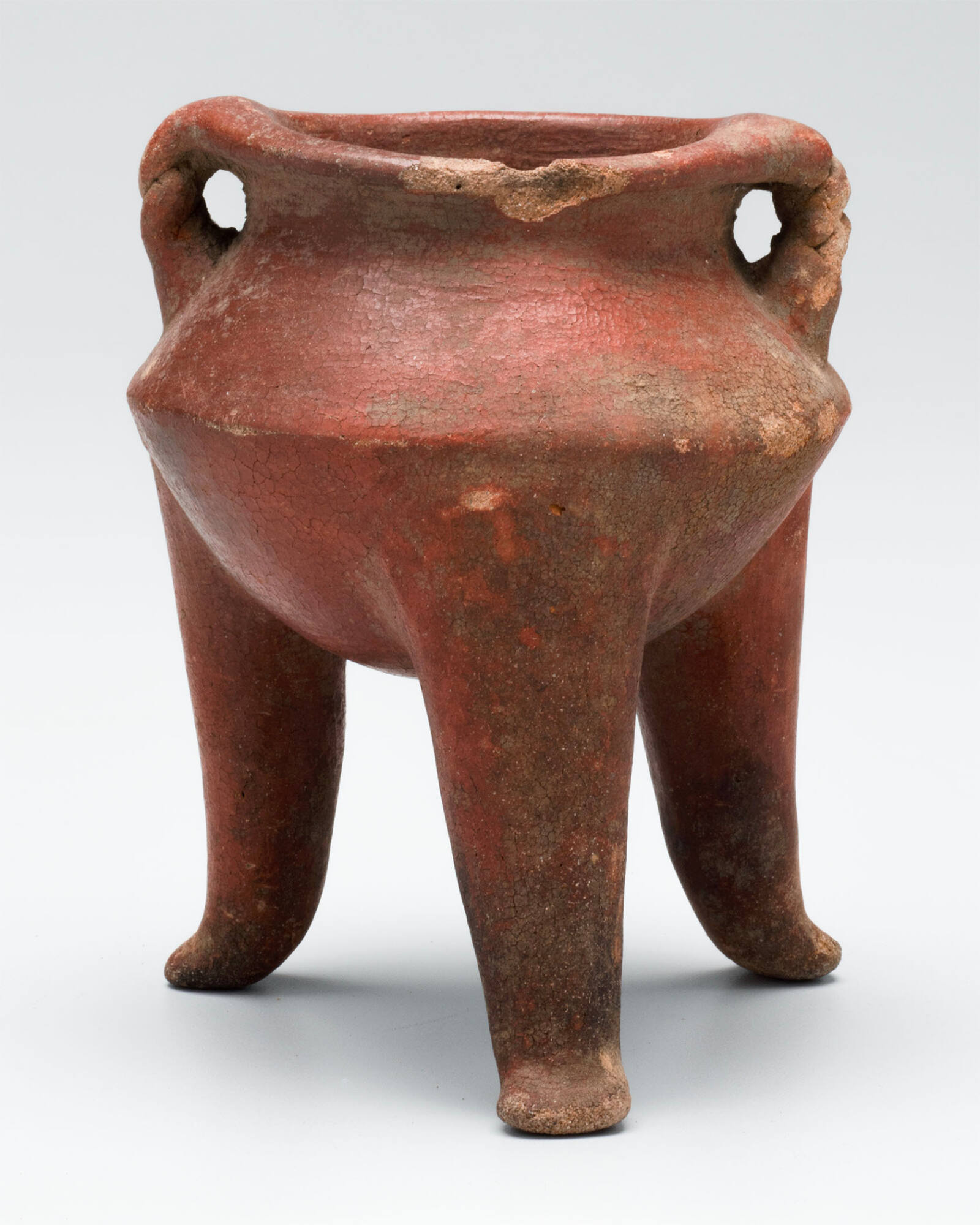 DescriptionThin red-glazed surface, crackled; handles, twisted rope motif.