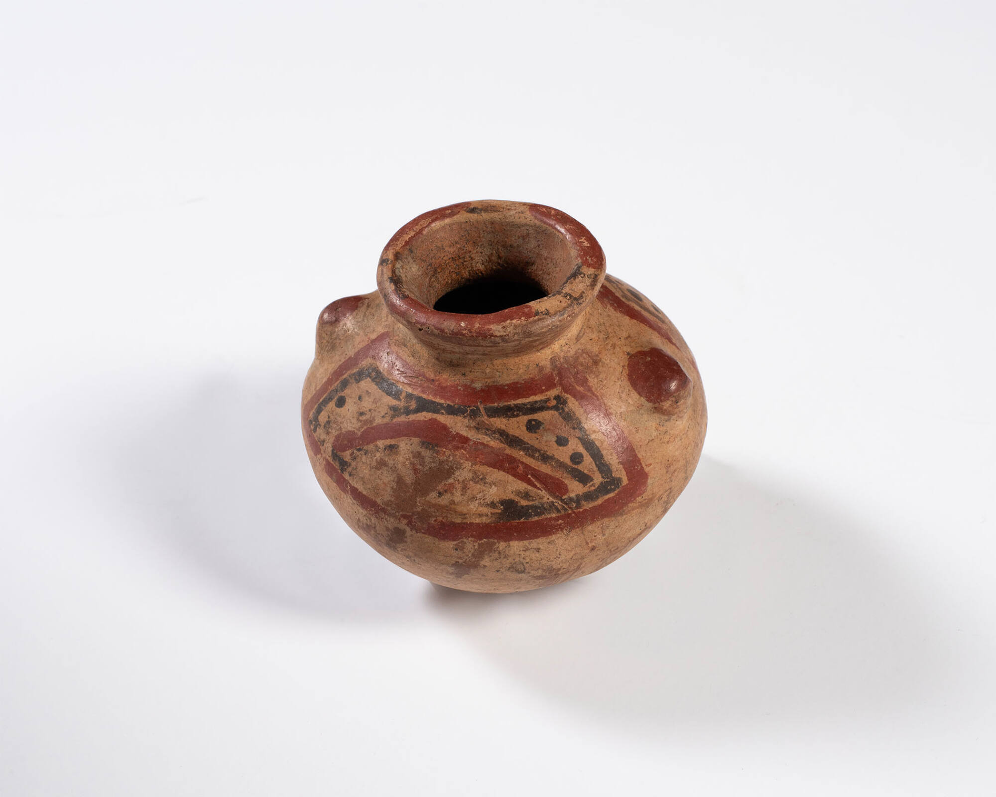 DescriptionJar with rounded bottom and knobs for handles.