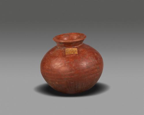 DescriptionPolished red surface with black-line design in resist technique.