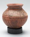 DescriptionRed polished surface, except at shoulder. Black-line design in resist technique.