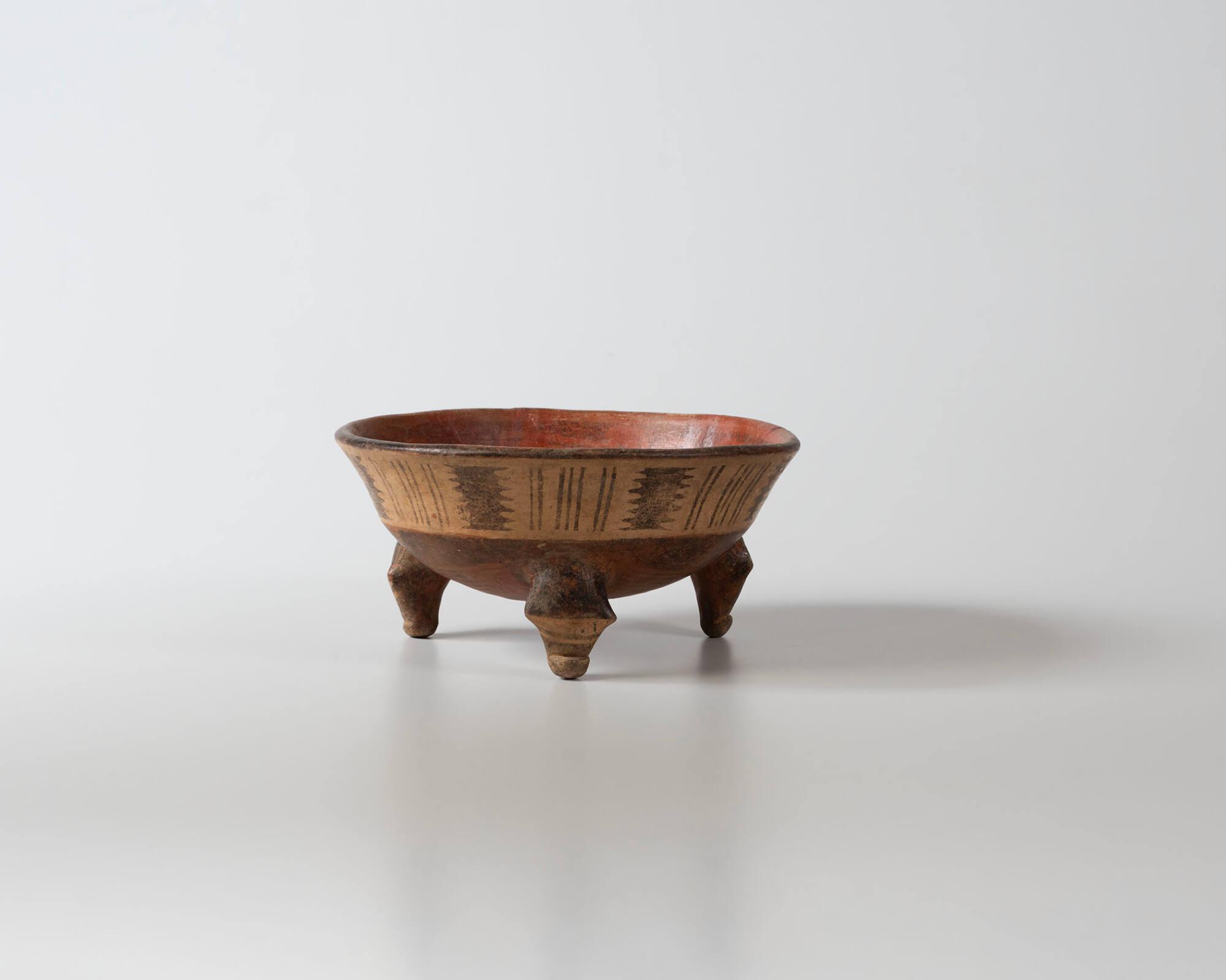 MediumGray ware. Covered with red and white slip. Decorated with black line pattern on outside; serpent pattern inside
