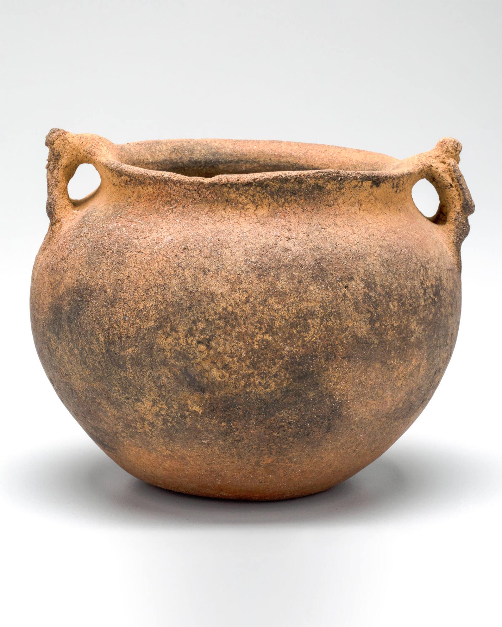 MediumGray ware, blackened by fire. Two ornamental figure handles