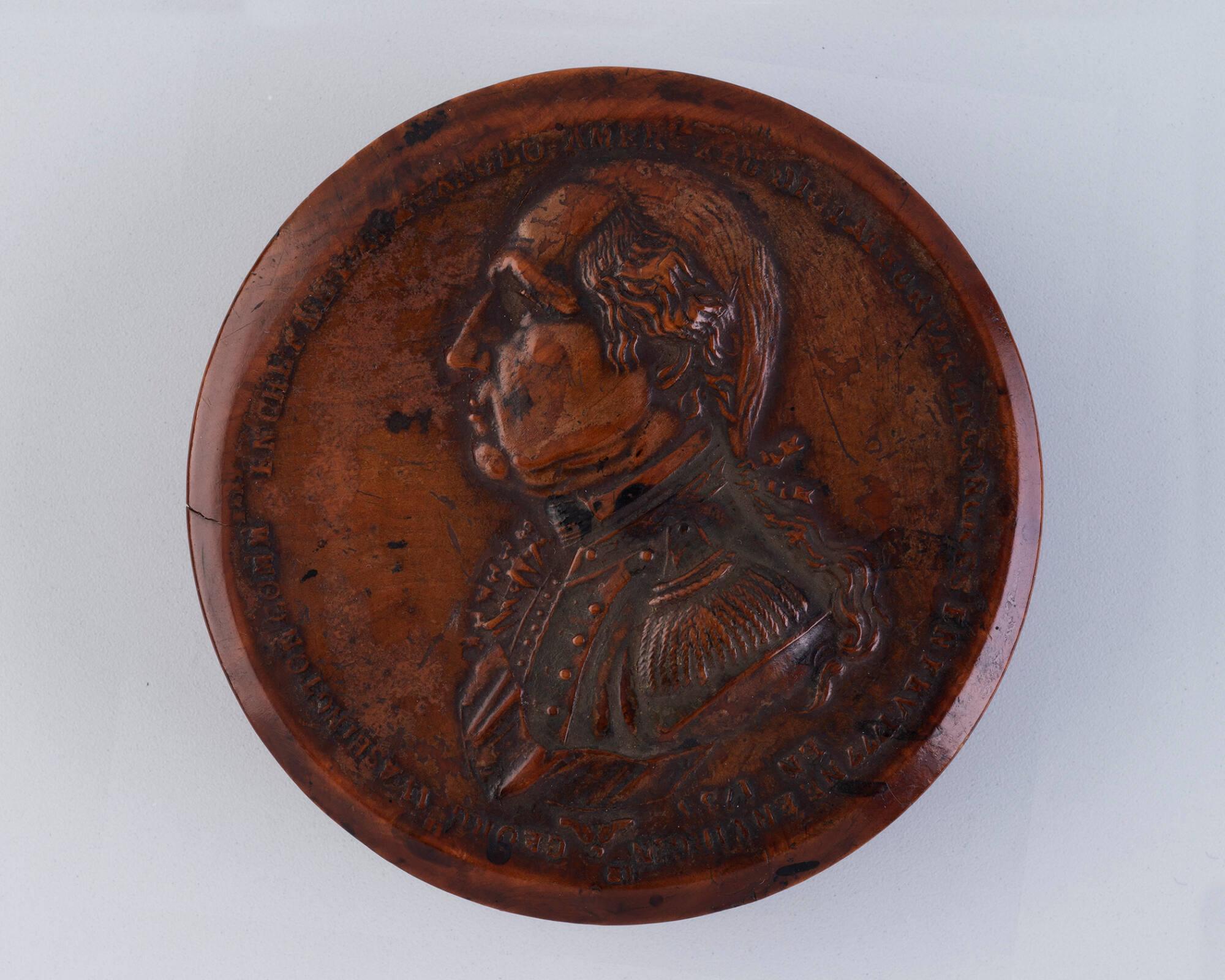 Cover bears bust of George Washington in relief, with inscription about the edge on cover.