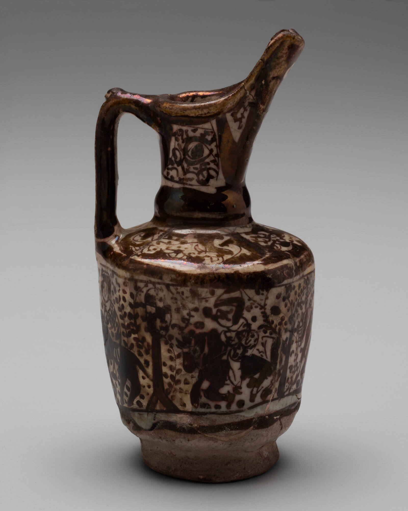 DescriptionAn eight-sided ewer with a tall spout and handle. Decorated with drawn scroll works on the neck and shoulder and horsemen and lollipop trees on the wall. Modeled after metalwork.