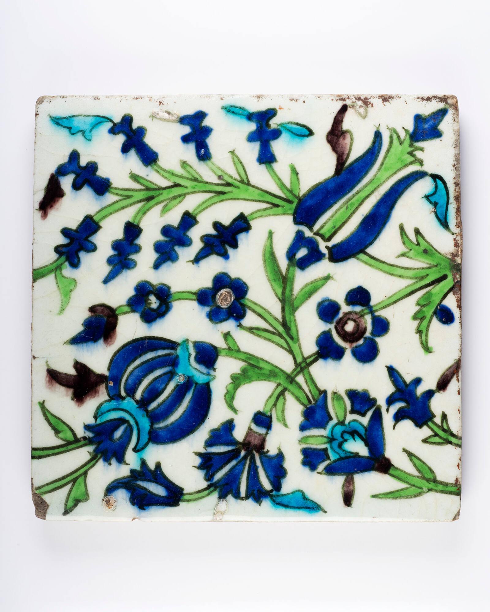 DescriptionPart of a larger group of tiles showing tulips, carnations, and blue-bells on meandering stalks in blue, green, and manganese. Coarse dense earthenware with polychrome glaze.