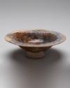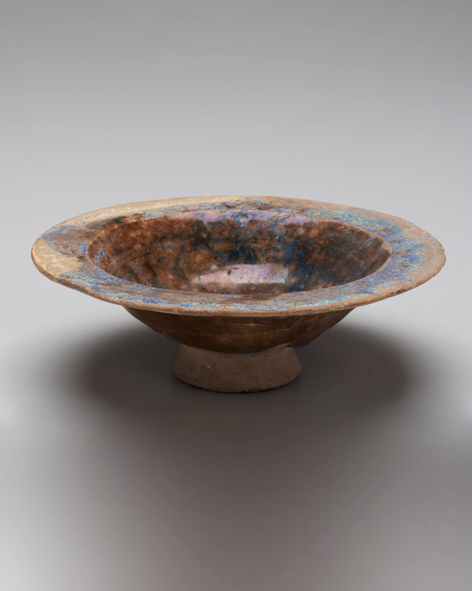 DescriptionShallow bowl with a wide flat rim. Covered with a thick deep blue glaze, completely iridescent on the outside. Inside floral scrolls in luster, now only partially visible.