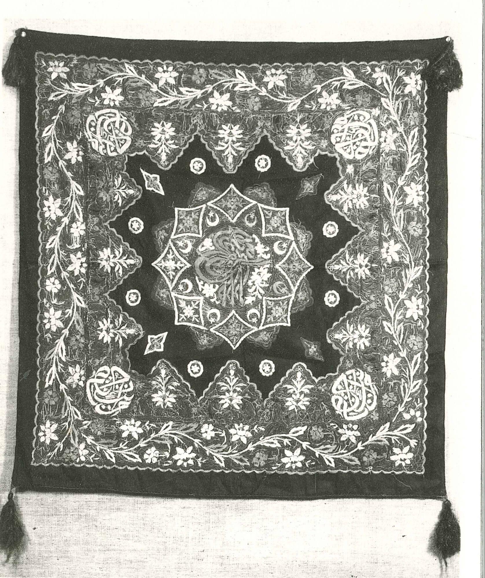 DescriptionFloral motifs in color surrounded with gold thread. Red inscription in center. Black ground.