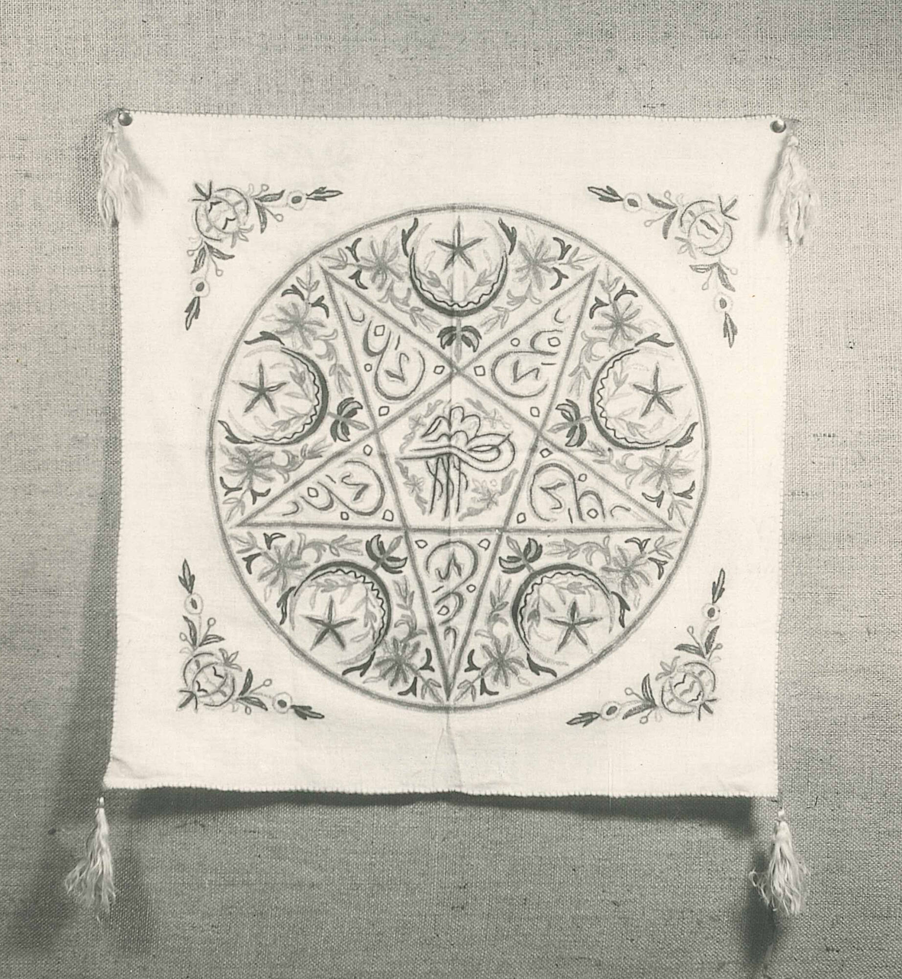 Description5-pointed star, crescent, stars and floral sprays in center circle in color and gold thread. Linen base.