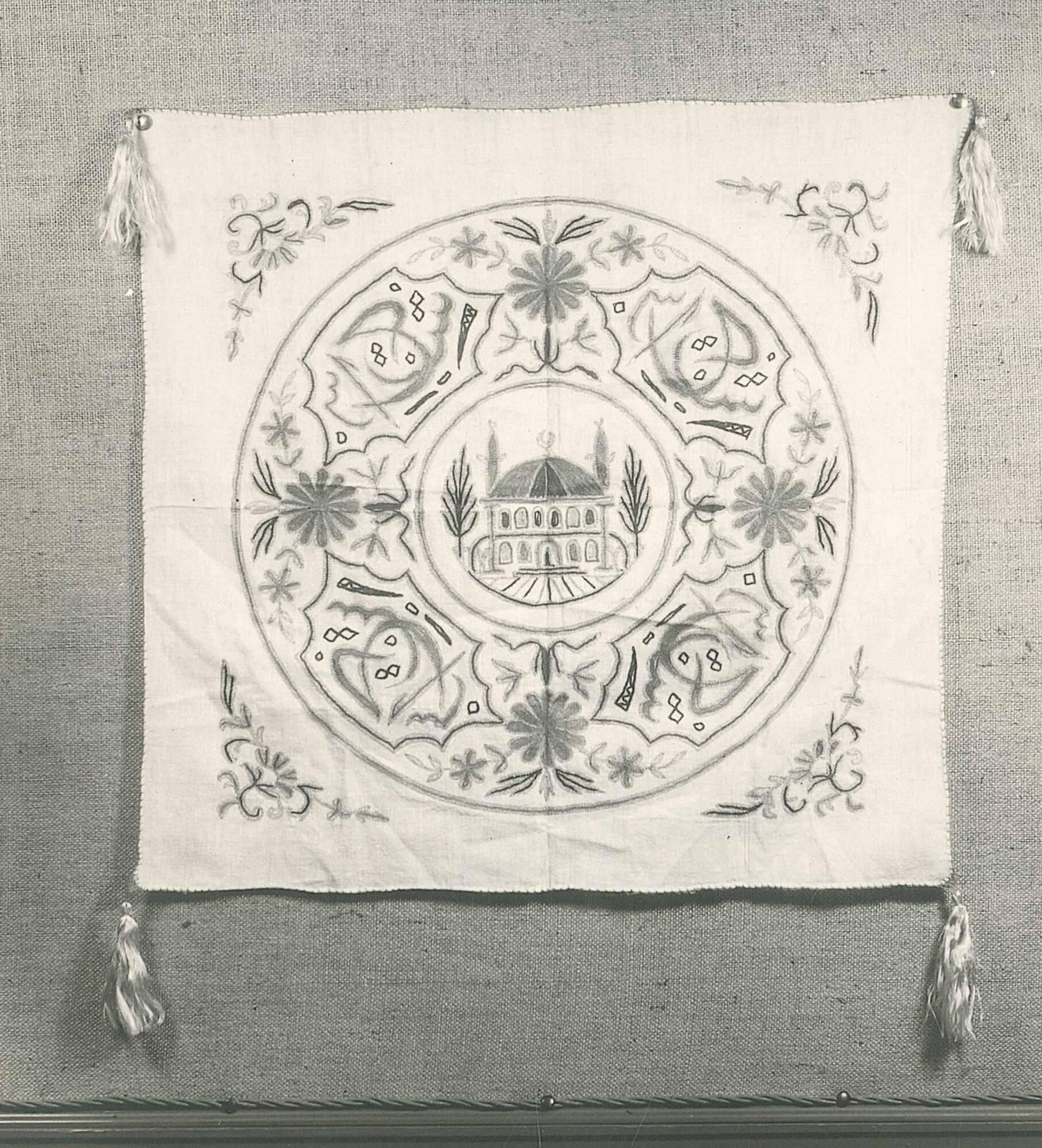 DescriptionMosque design in a circle. Color and gold thread. Flowers and characters.