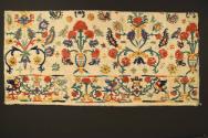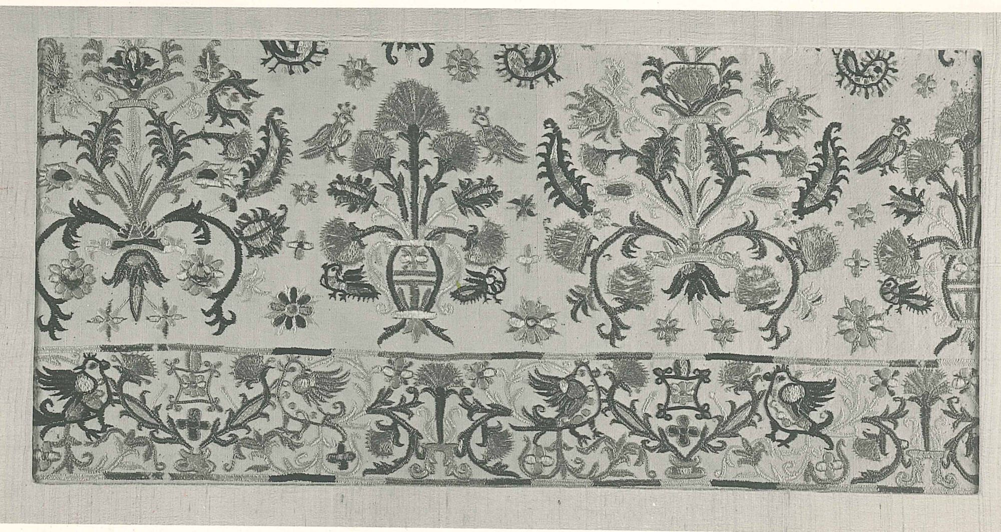 DescriptionVase and flowers pattern interspersed with bird motifs; in full color except violet; on a linen ground.