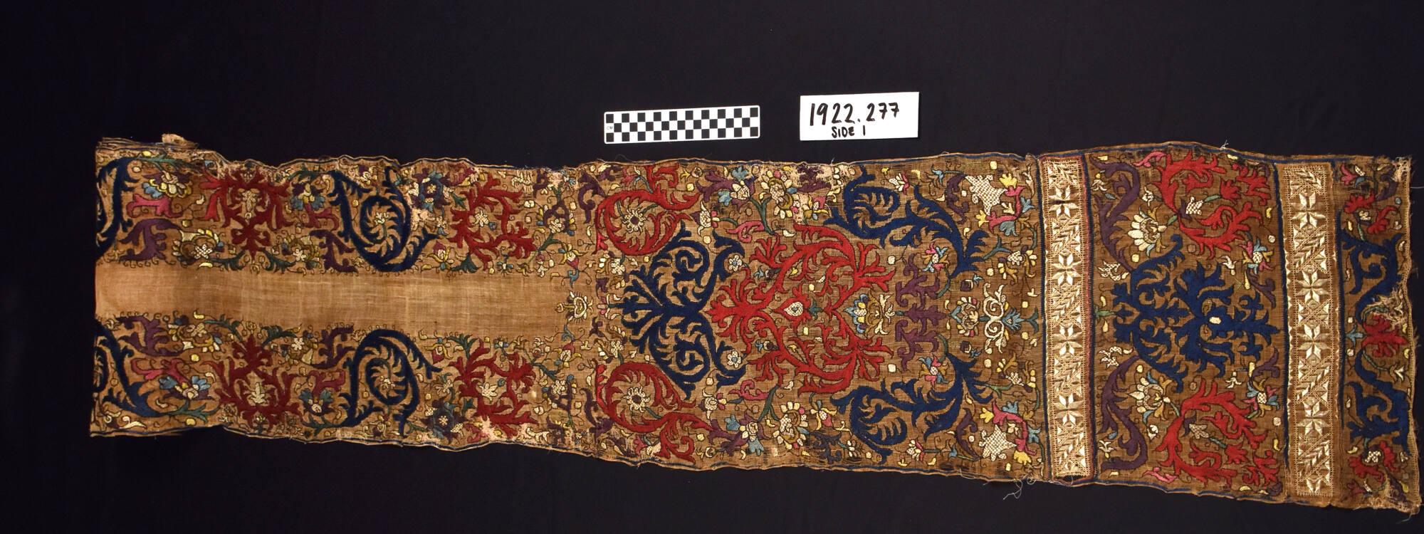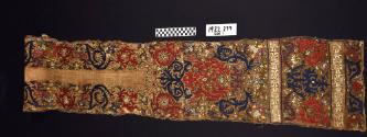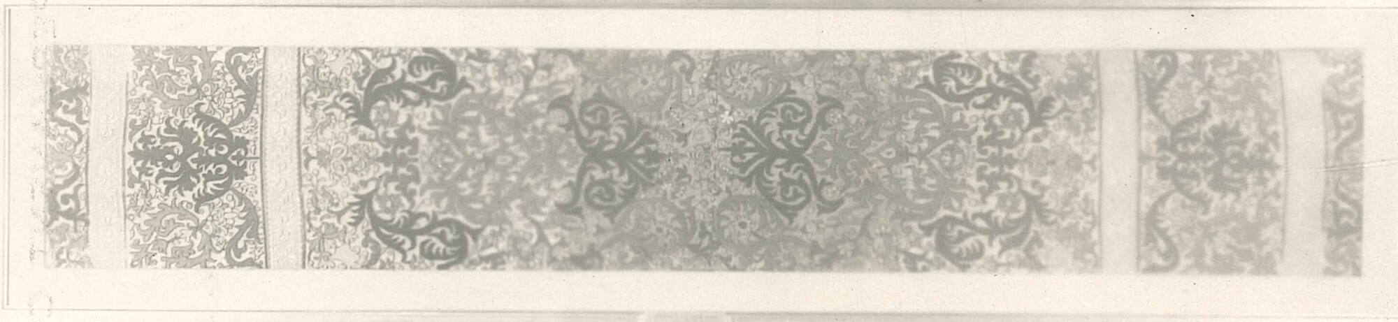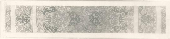DescriptionScroll patterns, interspersed with conventionalized leaves and flowers; full cover