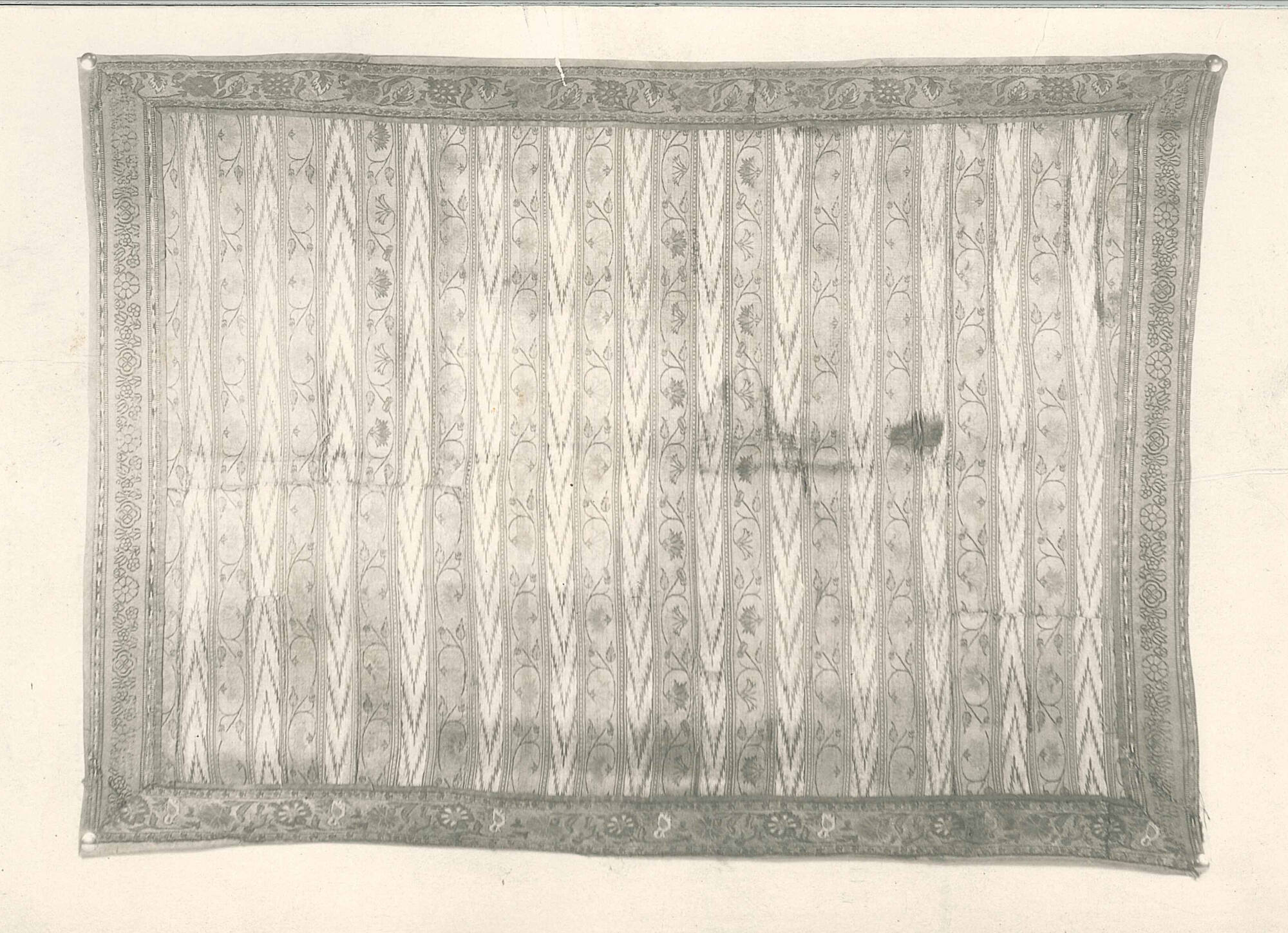 DescriptionAlternate stripes of flower, bud and leaf pattern in red, green, and black with dart pattern in white and brown. Added border.