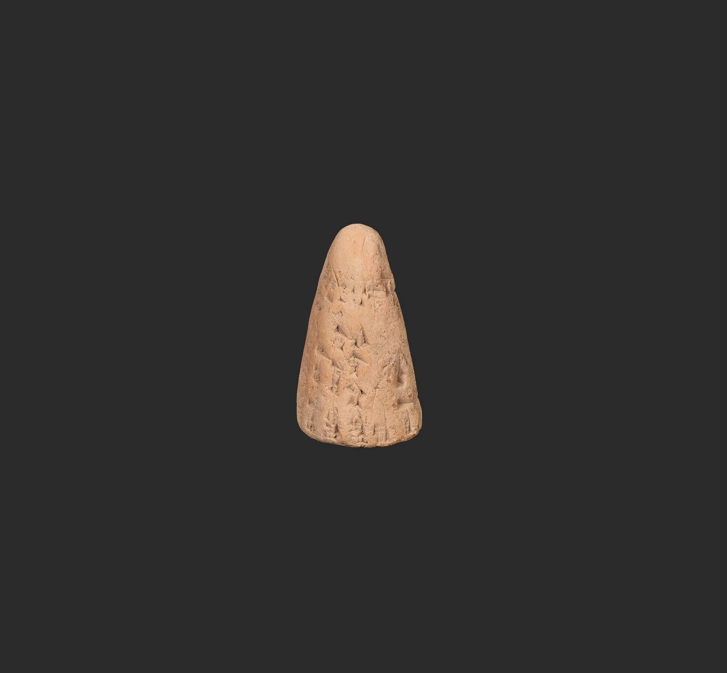 DescriptionTapered clay foundation cone inscribed in Sumerian cuneiform, bearing a royal inscription of Sin-kashid, King of Uruk. The text commemorates the construction of the Eanna temple, dedicated to Inanna, and Sin-kashid’s royal palace. The inscription is written in large cuneiform characters across the cone’s surface.
