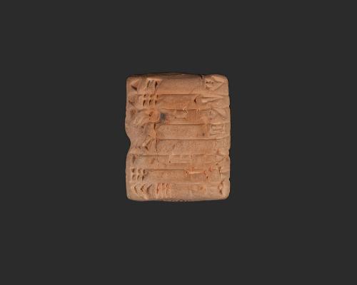 Label TextThis clay tablet, dating to the Ur III period (ca. 2100–2000 BC), served as an administrative record for livestock transactions. Written in Sumerian cuneiform, it lists cattle, sheep, and goats received by an official named Dungi-urmu. The text references a festival and bears the seal of Lu-Nannar. Tablets like this one were part of a sophisticated accounting system in Mesopotamian bureaucracies, ensuring detailed records of economic exchanges and temple distributions.Published ReferencesLangdon, S., "Miscellanea Assyriaca," Babyloniaca, 7, 1922-1923, p. 77-78, no. 11.