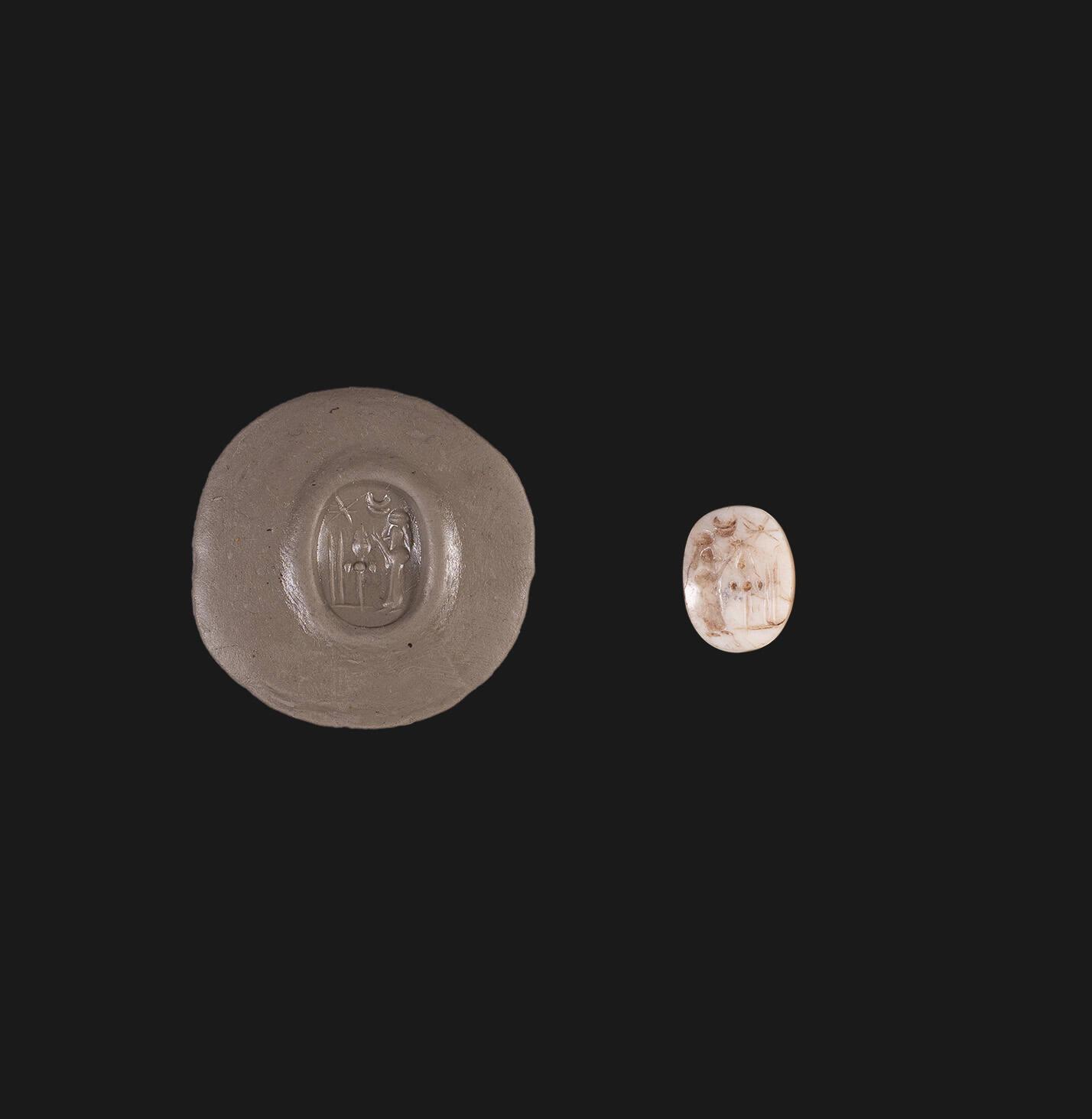 Label TextCarved in the first millennium BCE, this blue chalcedony stamp seal belonged to a society where such objects functioned as both personal ID and sacred amulet. Its imagery includes a bearded man—likely a worshipper—standing before divine emblems: a stylus for Nabu (god of writing) and a grouping of spears, possibly referencing Marduk (god of power and kingship). A double crescent and star above suggest cosmic significance. Seals like this were impressed into clay tablets, securing legal and economic records with an individual’s personal mark. Chalcedony’s hardness made it ideal for such intaglio carving, while its blue hue may have symbolized celestial or divine power. The seal’s compact form hints at it being worn or carried for daily use.Comparative ReferencesVon Der Osten, H.H., Ancient Oriental Seals in the Collection of Mr. Edward T. Newell, (OIP XXII), University of Chicago Press, Chicago 1934, pl. XXXVI.