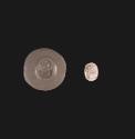 DescriptionThis small stamp seal is made of blue chalcedony and measures 1.9 cm in diameter at the base and 2.5 cm in height. It features a domed back and a carved flat base depicting a bearded man standing before a grouping of spears, a stylus, and divine symbols. Above the scene appear a double crescent and a star. The carving is executed in intaglio using stone-cutting techniques typical of the first millennium BCE. Pierced crosswise for threading.