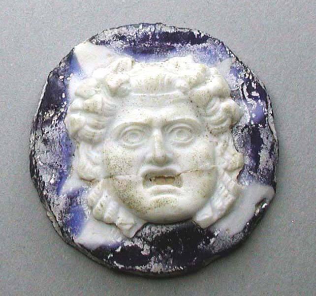 DescriptionCircular cameo glass medallion featuring a finely carved head of Medusa in opaque white relief over a translucent cobalt blue background. Likely a fragment from a larger object.