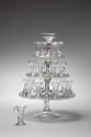 Label TextDuring the 18th century, a formal English luncheon table or evening dinner would have included an elegant dessert presentation known as a jelly tree. Stacked salvers displayed glasses filled with colorful jellies, sweetmeats, and syllabub, a rich dessert made with frothy sweetened cream curdled with lemon juice, wine or brandy (see illustration). Jelly trees were usually not acquired as matching sets: components were added or replaced over time.about 1725-1750