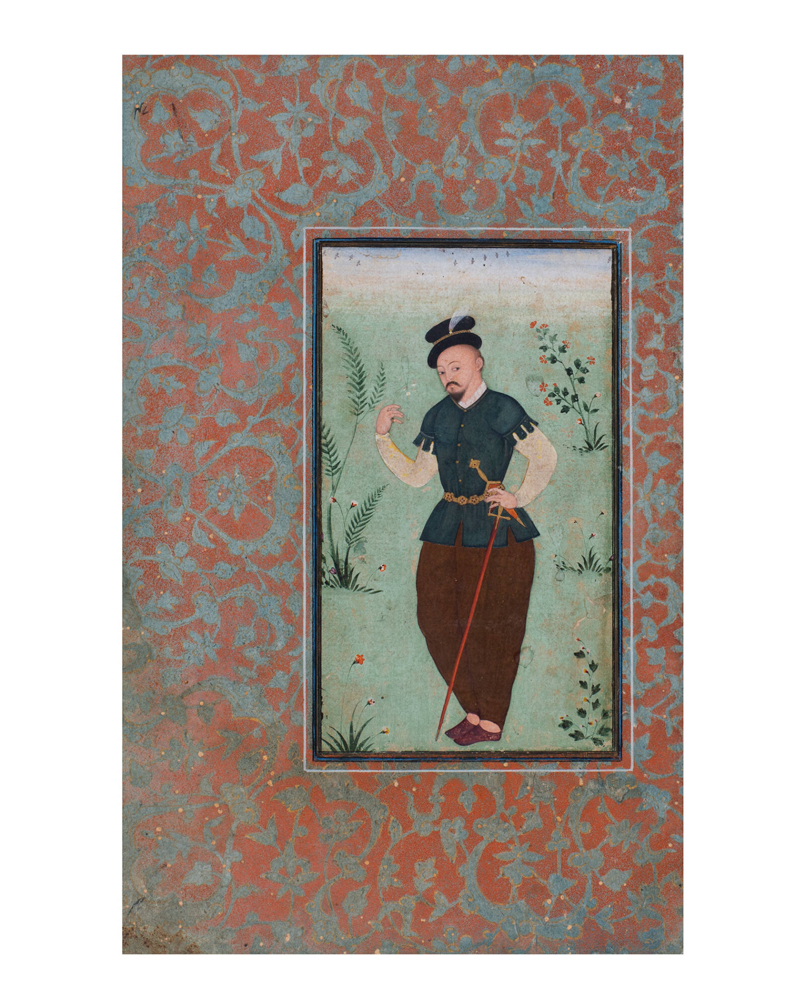 Label TextJust six years after the discovery of a sea route to India by the Portuguese explorer Vasco da Gama in 1498, Portugal colonized the coasts of the Indian subcontinent, establishing by force trading posts, settlements, and military forts. About a century later, an Indian artist painted this miniature of a Portuguese gentleman at the Mughal court of the Emperor Akbar (1542–1605). He is dressed in a late Renaissance European style except for his trousers. The foreigners retained their European cloaks and doublets in lighter materials for the warmer seasons, but replaced tight knee breeches and hose with loose trousers for comfort, gathered at the ankle for protection against mosquitoes.Published Referencesc.f. Susan Stronge, Painting for the Mughal Emperor: The Art of the Book 1560-1660, 2002, pp. 138-139, pls. 105 and 106; pl. 106 shows a European wearing similar billowing trousers. Rosemary Crill, "Visual Responses: Depicting Europeans in South Asia", in Anna Jackson and Amin Jaffer (eds.), Encounters: The Meeting of Asia and Europe , 2004, pp. 188-199. Milo Cleveland Beach, "Visions of the West in Mughal Art", in Jorge Flores and Nuno Vassallo e Silva (eds.), Goa and the Great Mughal, 2004, pp. 170-189. Beach illustrates two related early 17th century Mughal portraits of Europeans. The "Portuguese Gentleman" on p. 179 wears a similar hat and wide trousers held by a belt with floral buckles.Comparative ReferencesSee also Susan Stronge, Painting for the Mughal Emperor: The Art of the Book 1560-1660, 2002, pp. 138-139, pls. 105 and 106; pl. 106 shows a European wearing similar billowing trousers. See also Rosemary Crill, "Visual Responses: Depicting Europeans in South Asia", in Anna Jackson and Amin Jaffer (eds.), Encounters: The Meeting of Asia and Europe , 2004, pp. 188-199. See also Milo Cleveland Beach, "Visions of the West in Mughal Art", in Jorge Flores and Nuno Vassallo e Silva (eds.), Goa and the Great Mughal, 2004, pp. 170-189. Beach illustrates two related early 17th century Mughal portraits of Europeans. The "Portuguese Gentleman" on p. 179 wears a similar hat and wide trousers held by a belt with floral buckles. See also Crill, 2004, p.190. Hats became so closely associated with firingi that foreigners were known as topiwala (hat wearer). See also Beach, 2004, p. 177. See also Ibid. See also Crill, 2004, p. 190. See also Beach, 2004, p. 174. See also Ibid. pp. 175 and 177.