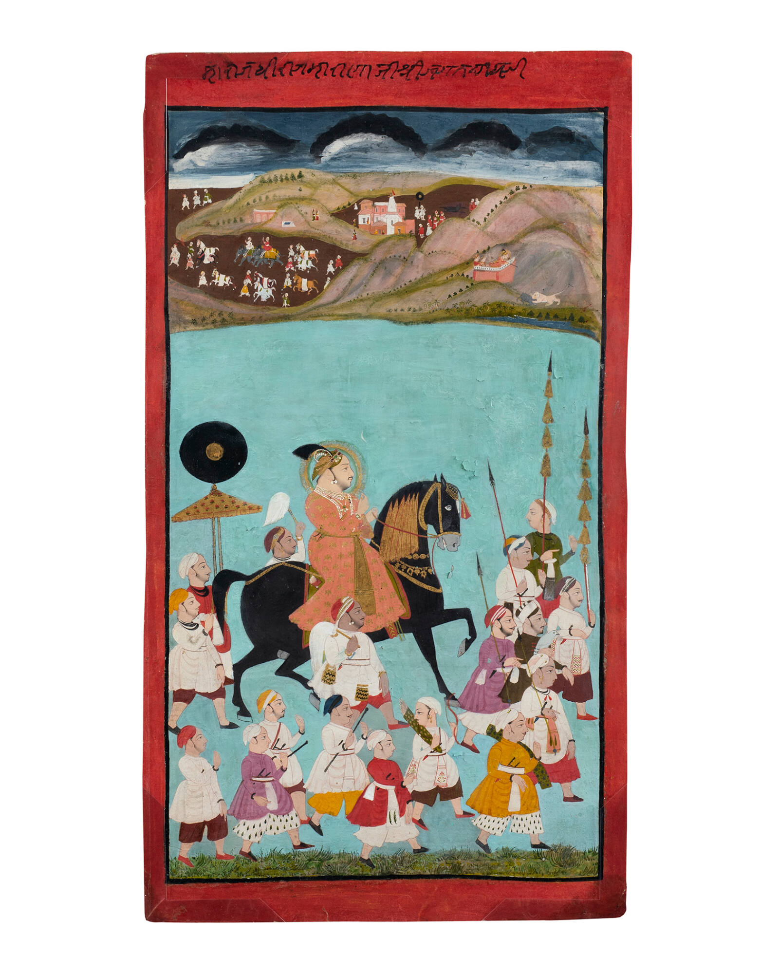 DescriptionA gold nimbus frames Jagat Singh's side profile. The attendants on foot behind the horse carry a flywhisk (chowrie), a royal umbrella and the royal insignia or changi, a standard with a disc of black felt or ostrich feathers and a gold solar symbol to the center. The attendants to the foreground carry staffs, a bow and quiver of arrows, and a rifle wrapped in a ceremonial gold textile. One of the courtiers walking before the horse carries a hawk, while his companions hold decorated staffs with gold tassels.